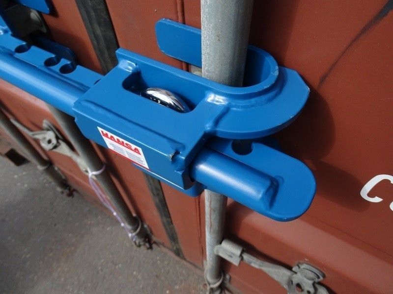 The container lock is placed around the door bars, pushed together and locked with the shackle lock.
